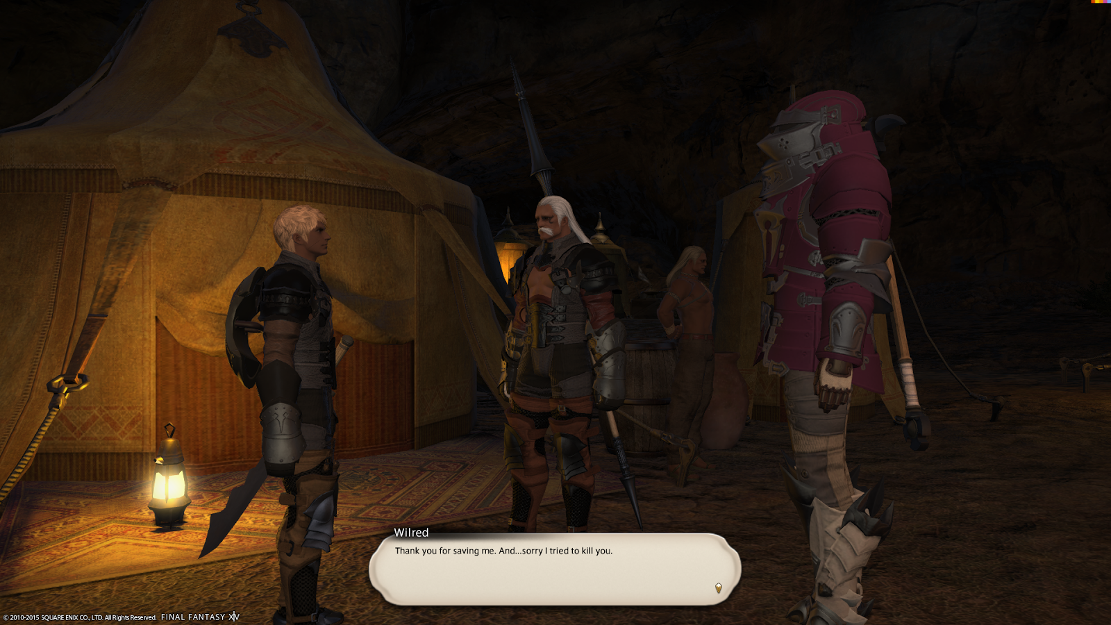 We then returned to Little Ala Mhiga with tidings from Meffrid which got us the in we needed. Gundobald told us of a Masked Man who's been seen near Little Ala Mhigo and asked us to investigate. So we did as commanded. One of the people we chatted with was Wilred. Chaide and I looked at each other after investigating him and said, "He's the one, and he's going to realize he did wrong, and regret it, and make it up to his people."